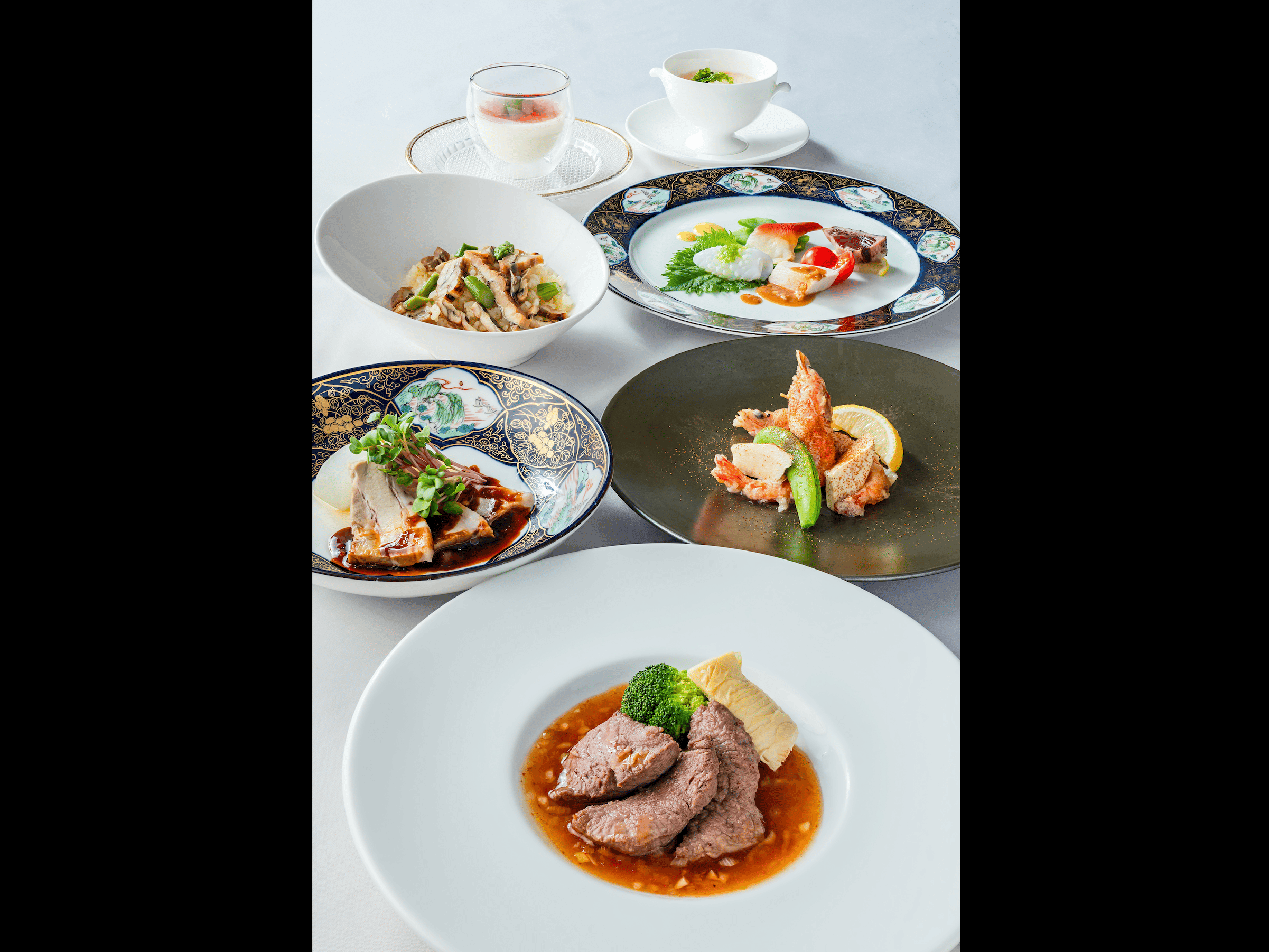 鲨鱼鳍是由蓝鲨的大尾鳍制成的。 放入蚝油中煮至软后 最后用慢慢煮沸的白汤添加浓郁的风味。 请搭配楼兰招牌青椒肉丝和虾酱一起享用。 <菜单内容> 各种时令开胃菜 炖大鱼翅尾翅 蚝油青椒黑毛和牛 三种蒸笼点心 辣椒酱大虾配炸蟹爪 今日炒饭或者汤荞麦面 楼兰特色软杏仁豆腐和中式点心