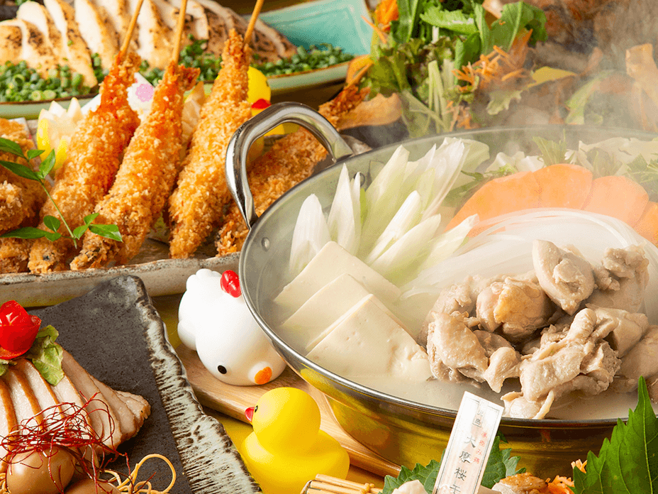 【黄金鸡(Koganedori)套餐】 这是一个使用大量时令食材的全套套餐,含有4种特色开胃菜、萨摩极品鸡(大摩樱)刺身、低温烹制的鸡肝刺身、带头虾和时令蔬菜炸串等! 包含的无限畅饮是含生啤酒的高级套餐♪